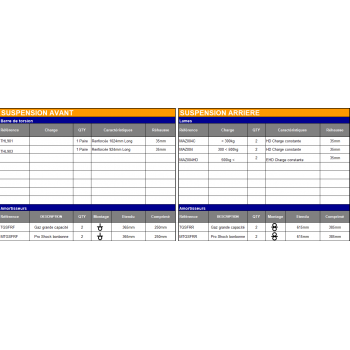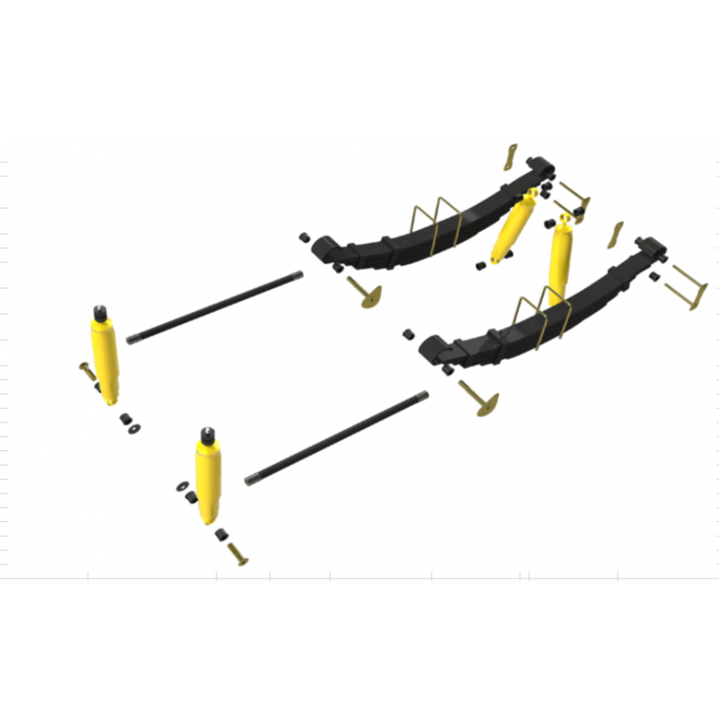 Kit amortisseur ProShock TERRAIN TAMER comprenant 4 amortisseurs, 2 ressorts (tarage au choix), 2 lames, ainsi que l’ensemble des composants associés : silentblocs, brides, jumelles et axes de lames. Conçu pour répondre aux besoins de remplacement et d’entretien du système de suspension