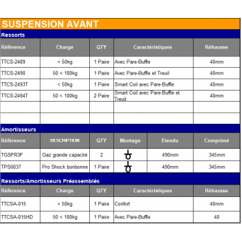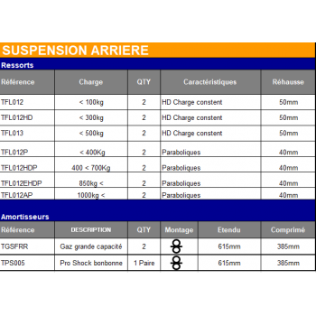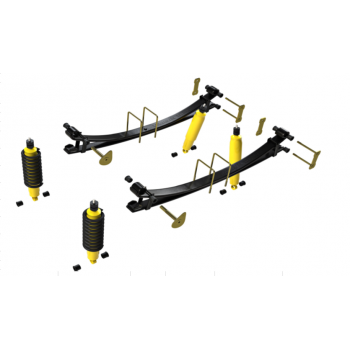 Kit suspension TERRAIN TAMER comprenant 4 amortisseurs, 2 ressorts (tarage au choix), 2 lames, ainsi que l’ensemble des composants associés : silentblocs, brides, jumelles et axes de lames. Conçu pour répondre aux besoins de remplacement et d’entretien du système de suspension.